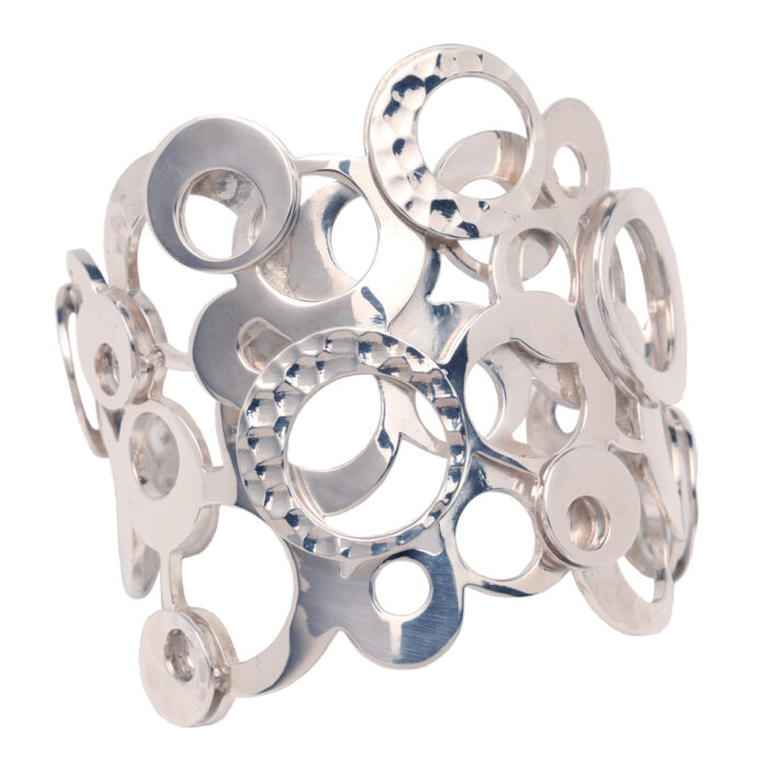 B A S I C I D E A :epicycles, which are circles whose centers lie on the perimeter of other circles. Mainly inspired by mathematics but also by the logo of our brand, we created this unique piece of modern design jewellery .The difference in the level of the circles is accentuated by the use of hammered surfaces, an ancient greek technique, method which adds depth and sophistication to the bracelet.